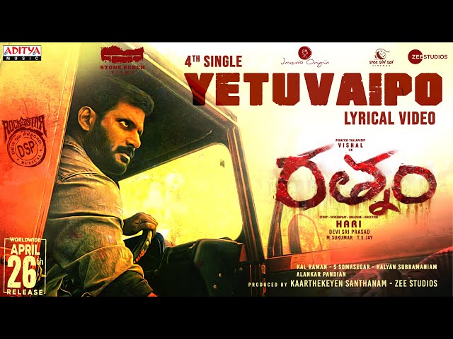 Yetuvaipo Song Lyrics Telugu song from Rathnam. Music is composed by Devi Sri Prasad and sung by Hariharan. Yetuvaipo Lyrics written by Shree Mani. Rathnam cast Vishal, Priya Bhavani Shankar, Samuthirakani, Yogibabu and Gautham Vasudev Menon